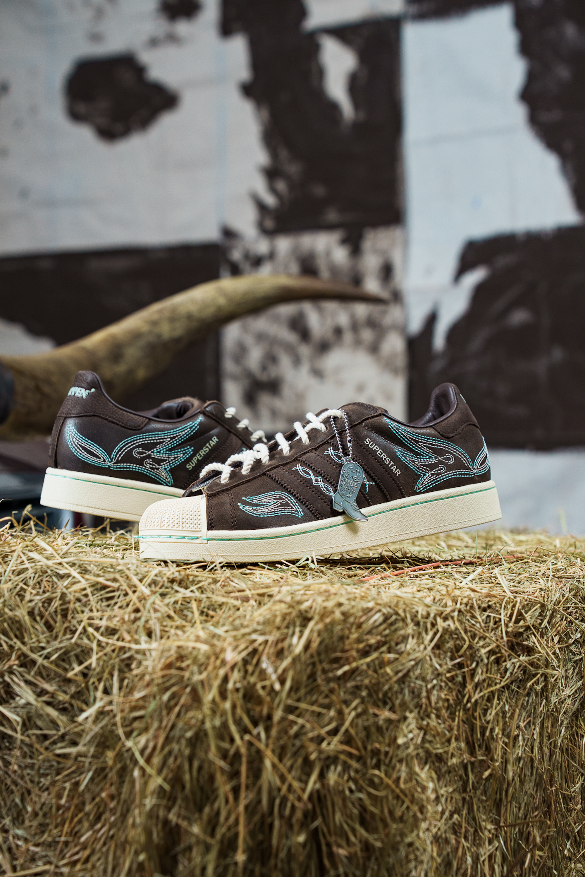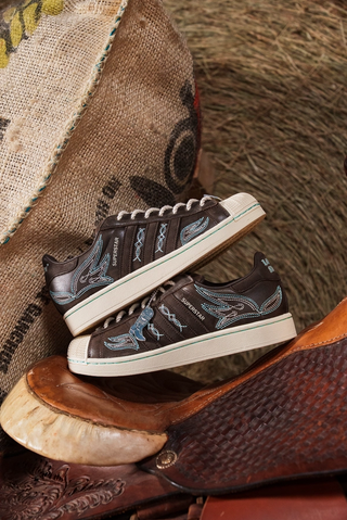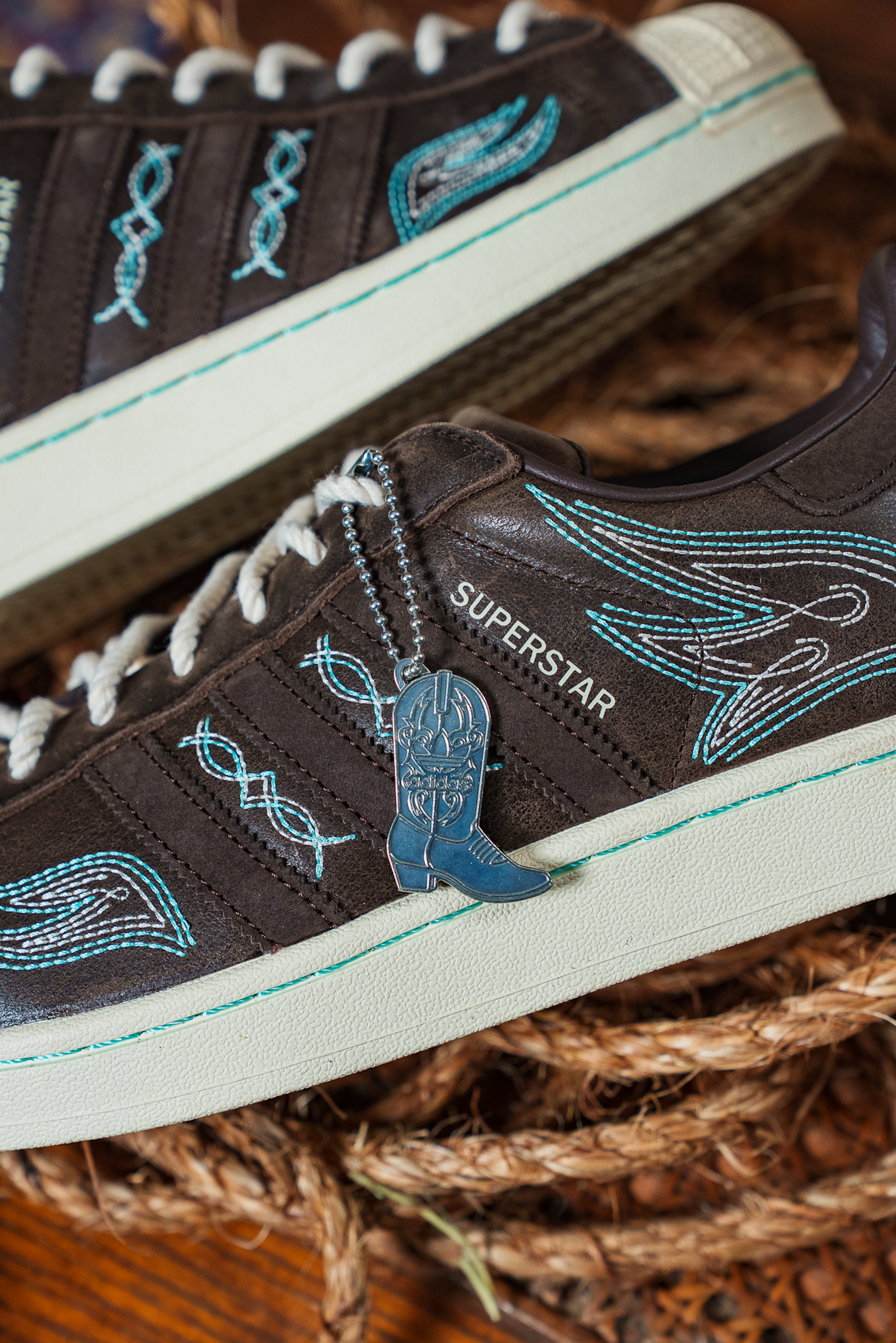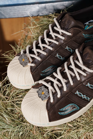 The shoe itself features an off white, brown, and vibrant turquoise color scheme that features a number of embroidered details rooted in Western-wear styles. A boot-shaped hangtag arrives with the pair, while the Superstar's moniker is found between both shoes' Achilles' heel tabs. A custom belt-buckle dubrae, four interchangeable lace options, and cowhide-print insole round out the pair.