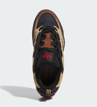 Atop a classic black and gum sole unit, the pair’s construction starts with a ballistic mesh upper, matching tongue, and liners all dressed in black. Two-tone suede overlays in tan and brown work across the upper, offering contrast and a premium feel. Black nubuck covers the toe, while synthetic brown toe caps add an extra layer of textural depth. To complete the design, vibrant pops of red hit the Trefoil branding at both the tongue and heel, adding just the right amount of flair.
