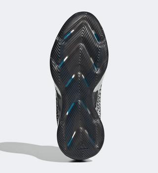 Blue detailing adds a pop of color to the ensemble, visible on the Adidas logo located on the heel, enhancing the visual appeal and branding. This subtle inclusion of blue not only breaks the monochrome but also ties the design elements together, creating a cohesive and attractive package.