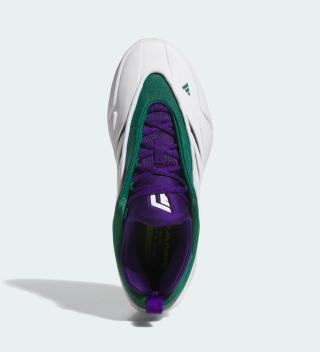 The Adidas Dame 9 "Bucks" presents a palette perfectly aligned with the Milwaukee uniforms, integrating the team's signature hues into the design. The sneaker features a striking white leather upper that serves as a clean canvas for the more vibrant elements of the design. A collegiate green wraps around the upper edge, adding a bold contrast, while the internal bootie boasts a rich purple that adds an unexpected pop of color.
