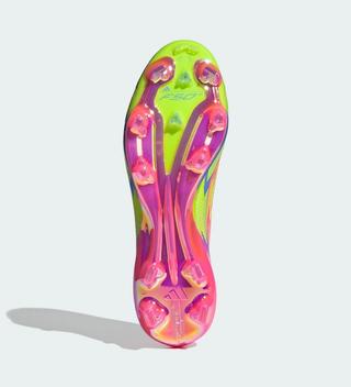 The "Mystic Victory" colorway blends a vibrant pink and blue toe cap with a zig-zag arrow pattern in 'Lucid Lemon,' creating a look that is as eye-catching as it is innovative. The large F50 lettering on the upper is a standout feature, while the 3-stripes logo is absent, giving the boot a sleeker, more contemporary aesthetic. The shoe's sole transitions from 'Lucid Lemon' at the upper to 'Lucid Pink' as it reaches the heel, rounding out the color scheme with an energetic flair.