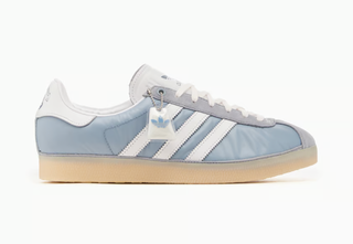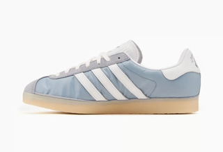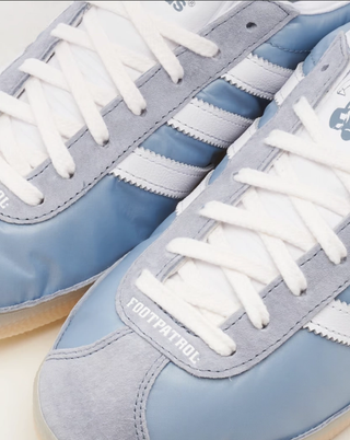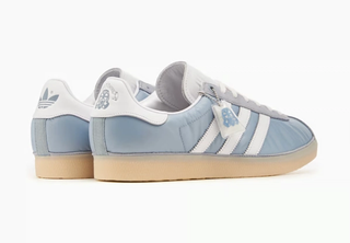 The Footpatrol x adidas Gazelle is crafted with a nylon base that’s filled with Primaloft material, offering insulated wear ideal for colder climates. The upper is adorned in a soothing light blue, contrasted by crisp white leather accents on the stripes, tongue, and laces, which enhance the clean and fresh aesthetic of the shoe. Adding to its unique appeal, the sneaker features a greyish suede on the toe cap and eyestay strips, along with subtle foxing above the midsole—a design twist not typically seen on mainline Gazelle pairs.