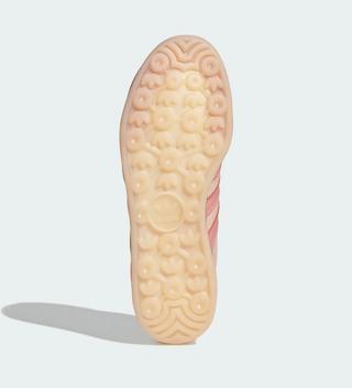 The upper is crafted from silky peach satin, giving the shoe a rich, soft texture that enhances its blush hue. Leather and suede details make up the Three Stripe branding, heel, and T-toe overlays, adding depth and contrast to the monochromatic design. Pastel pink leather liners, satin eyestays, and laces add light to the overall aesthetic. To complete the look, a semi-translucent pink rubber sole ties everything together, offering modern refinement.