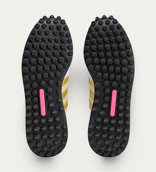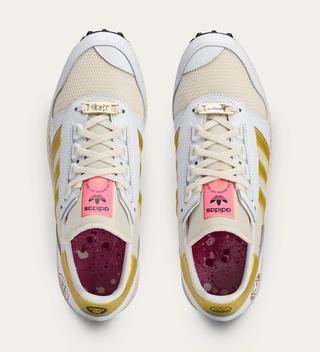 The collaboration doesn’t shy away from overt branding, showcasing co-branded details on the ankles, heels, and gold dubraes that carry Goldie's iconic graffiti motifs. This artistic influence extends to the pink tongue tags and graphic insoles, infusing the design with a personal touch that fans of both Goldie and Adidas SPZL will appreciate. Beneath the striking upper, the shoe is grounded by a classic netted midsole paired with a durable black rubber tread, ensuring that the design is as functional as it is visually compelling.