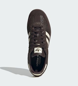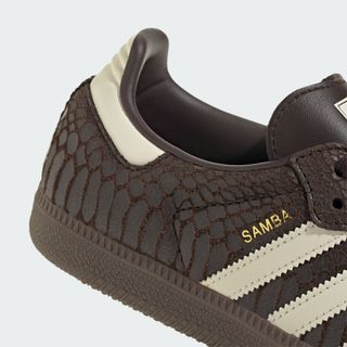 White leather Three Stripes and heel detailing provide contrast against the darker, scale-like upper, while gilded branding on the tongue and sidewall delivers a refined finish. The gold accents nod to heritage Sambas of the past, helping balance the more expressive texture with classic adidas Originals cues.
