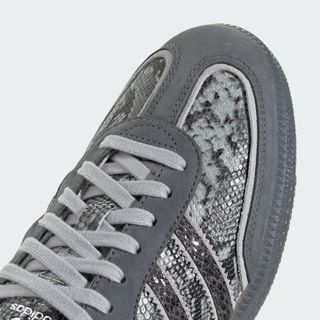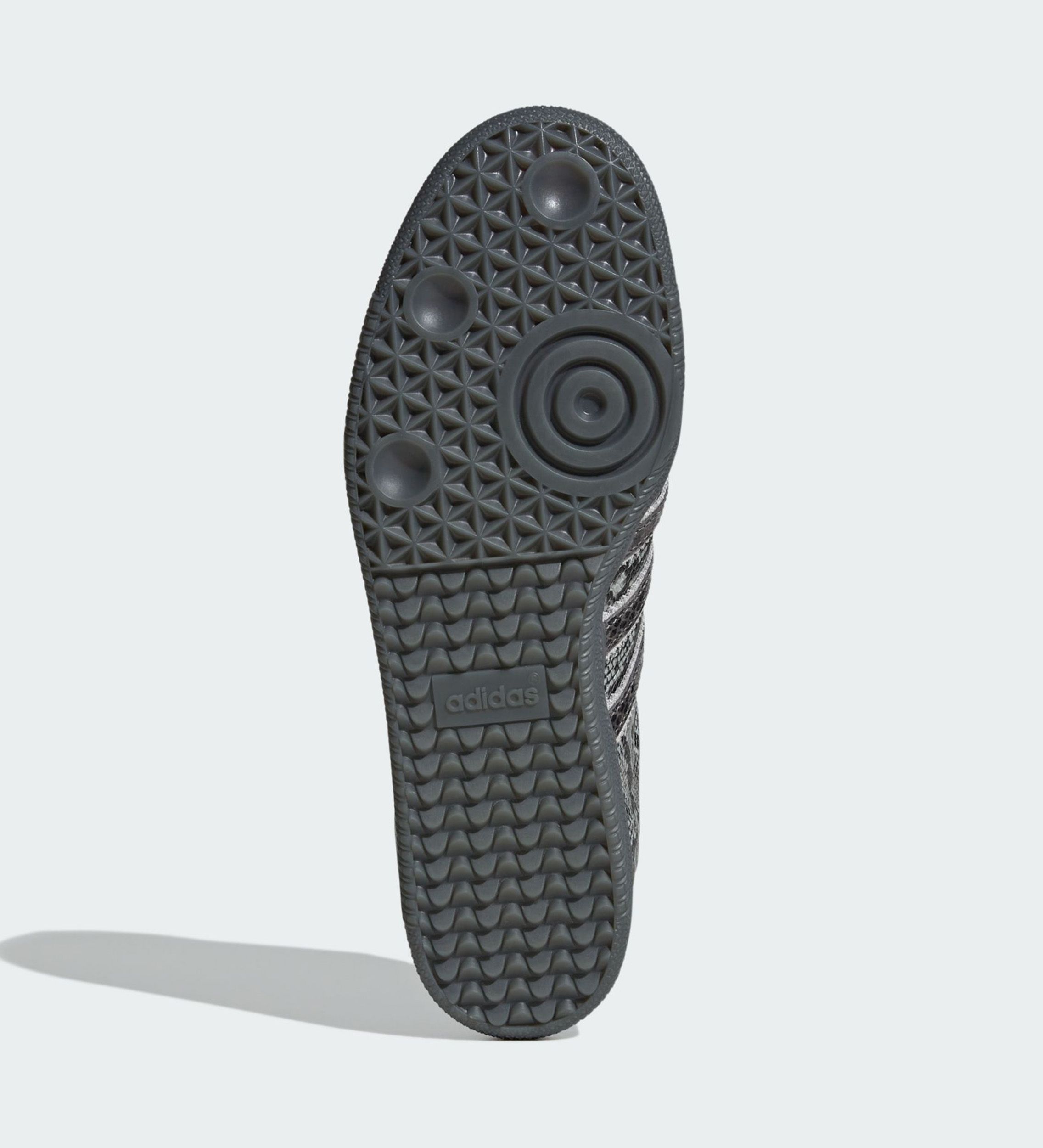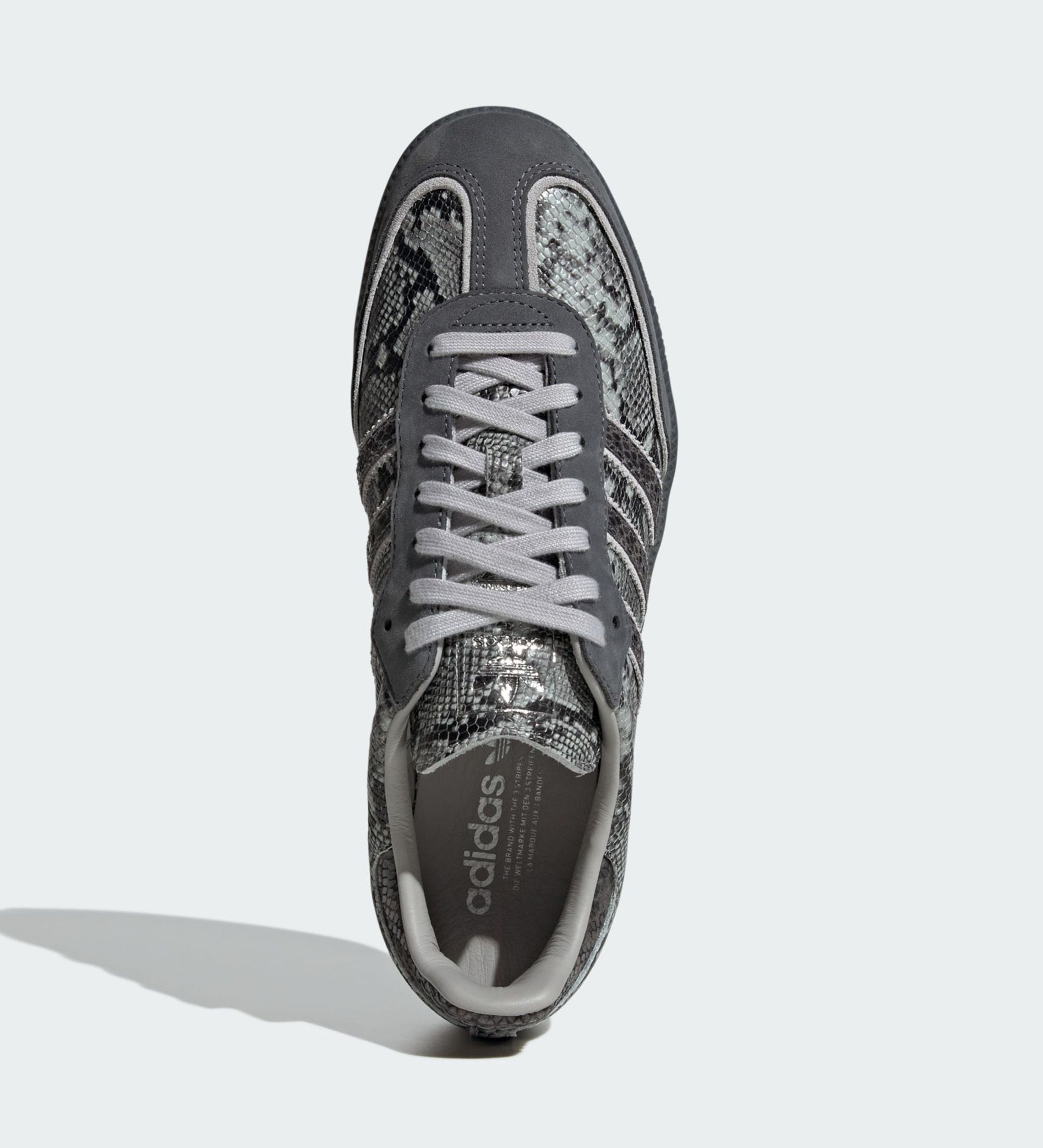 At its core, the adidas Samba remains unchanged. The low-profile silhouette, streamlined toe, and classic gum rubber outsole all stay true to the model’s football-turned-street heritage. What elevates this iteration is its serpentine-inspired upper, rendered in layered grey snakeskin textures that give the shoe a more dimensional, almost premium finish.