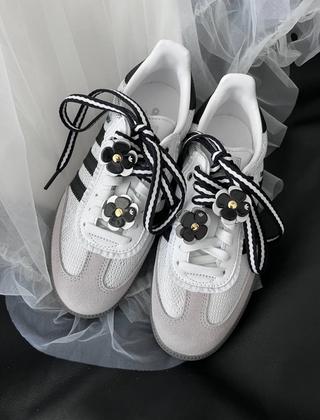 This special edition retains the iconic White/Black/Gum color scheme but introduces a unique twist with specially crafted lace uppers. Delicate fabric trim nestles below the eyestay overlays, offering a subtle textural contrast. However, the true highlight of this design is the oversized metallic and enamel floral lace bling. Each shoe features a pair of these eye-catching adornments, turning the traditional soccer sneaker into a statement piece.