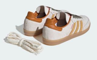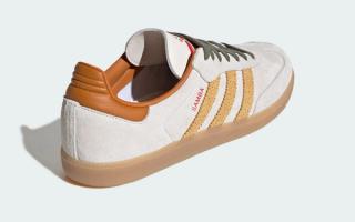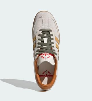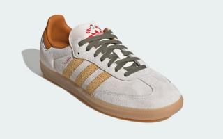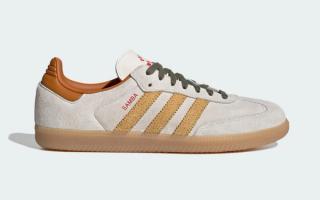 The pair captures the look and feel of the crispy dish through a refined material mix and warm color palette. The suede upper takes on a light beige hue reminiscent of the batter, while the Three Stripe overlays adopt a textured, fried-style appearance that echoes the golden crust of Taiwanese popcorn chicken. Pops of red branding hit the tongue and lateral “SAMBA” text, with olive-green laces offering a savory contrast. Additional touches include a tan leather lining, gold foil Taipei branding at the heel, and special chicken-graphic tongues and insoles — a nod to the dish’s cultural roots and street-food heritage.