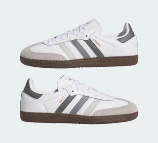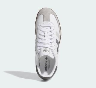 Akin to one of the silhouette's most popular looks, the bulk of the impending adidas Samba features a clean white finish across its supple leather upper. Suede reinforcement in the shape of a "T" introduce the first bit of grey, which appears in different shades across the iconic profile 3-Stripes branding. Trefoil logos and ribbed Achilles' heel panels also indulge in the greyscale makeover. Underfoot, the color story changes, but remains true to the low-top sneaker. A dark gum brown sole unit rounds out the versatile option.