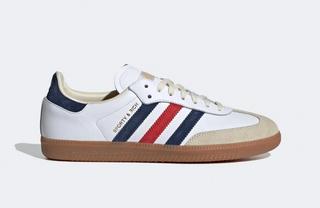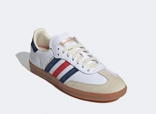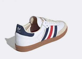 The Samba OG in the Sporty & Rich x Adidas "Olympic" collection sports a clean white body accented by two blue stripes and a central red stripe, directly mirroring the colors of the French flag. This design not only celebrates the host nation's rich heritage but also infuses a sense of national pride into the shoe. Gold detailing adds a touch of luxury, reminiscent of Olympic glory, making the sneaker a symbolic piece of athletic and cultural history. The classic gum outsole remains, ensuring that the sneaker retains its authentic appeal, while a blue and red insole further enhances the thematic design.