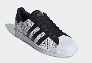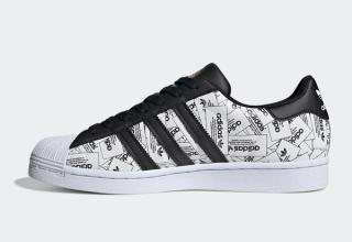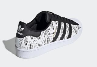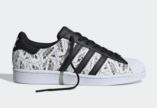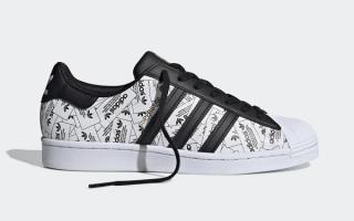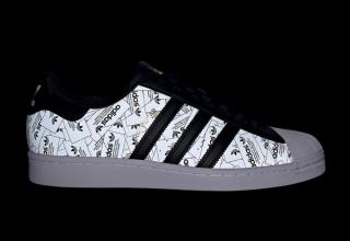 This simplistic effort arrives in predominately black-and-white, its upper consists of a collage of trefoil rectangular branding which comes to life under a bright light or flash. Black contrasting accents feature across the leather Three Stripes, eye-stays, tongues, and heel overlays, as well as hitting the laces and liners. The iconic shell-toe arrives in fresh white and blends effortlessly into the classic white sole unit. Capping off the design is a splash of gold foil on the tongue and white Trefoil flags in the rear.