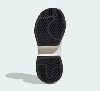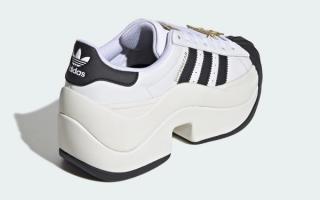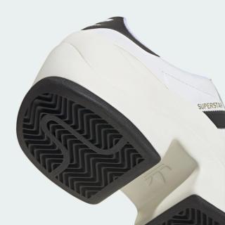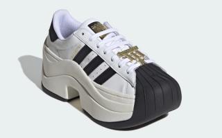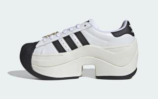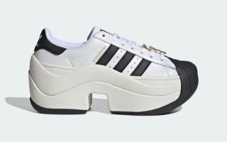 The Adidas Originals offering takes on a classic "Footwear White/Off White/Core Black" color scheme. Much of the upper harkens back to the design's most traditional build, but the rubber toe cap and bulk of the sole unit deviate from heritage, opting for a bold, fashion-forward aesthetic. Cues from the Superstar Millennium appear across the exaggerated platform midsole, which opts for an off white finish. The aforementioned shell-toe doubles-down on its role as "armor" of sorts, donning a black presentation that extends onto the segmented, rubber outsole.