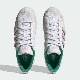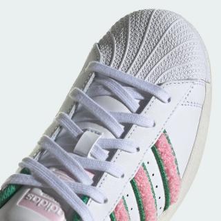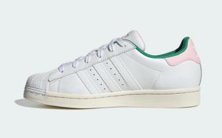 At its core, the shoe sticks to the Superstar formula: smooth white leather uppers, a textured rubber shell toe, and a slightly yellowed midsole that gives the pair a worn-in, summer-appropriate finish. The update comes through the details, where adidas swaps out traditional leather Three Stripes for plush pink chenille panels, outlined in green stitching for contrast. The result feels tactile and expressive without overwhelming the silhouette.