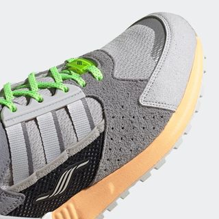 Arriving anchored in tonal grey, white, and black, the pair presents in a mix of mesh, suede, and plastic pieces. From light white at the heel to mid greys and the mesh and toe, to dark grey and black at the midfoot, the pair works through several shades along the spectrum. From there, the titular orange hue, which is sherbert-like in appearance, hits the midsole and is mirrored up top by a vibrant neon green lace selection. Completing the design is black Trefoil branding at the tongue and heel, insoles of the titular orange, and signature Torsion dubraes at the forefoot.