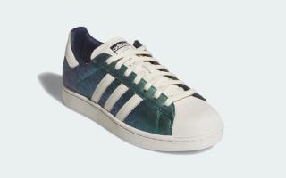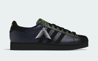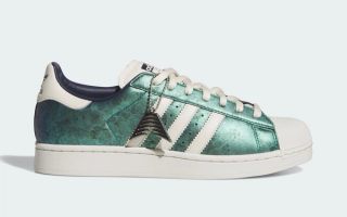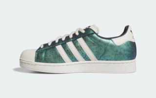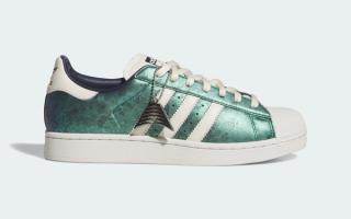 This off-court capsule delivers contrasting concepts. The first pair arrives with a shimmering, iridescent glitter finish across its upper, giving the classic shell-toe a bold, eye-catching refresh. The second adopts a more textured look, dressing its panels in faux crocodile skin with vibrant colored accents that shift from green to blue. A third option sees high-quality leather uppers reimagined in a gradient patterned finish that brings green into the mix. All pairs retain the Superstar’s timeless toe cap and Three Stripes detailing, while a custom metallic hangtag adds a signature touch.