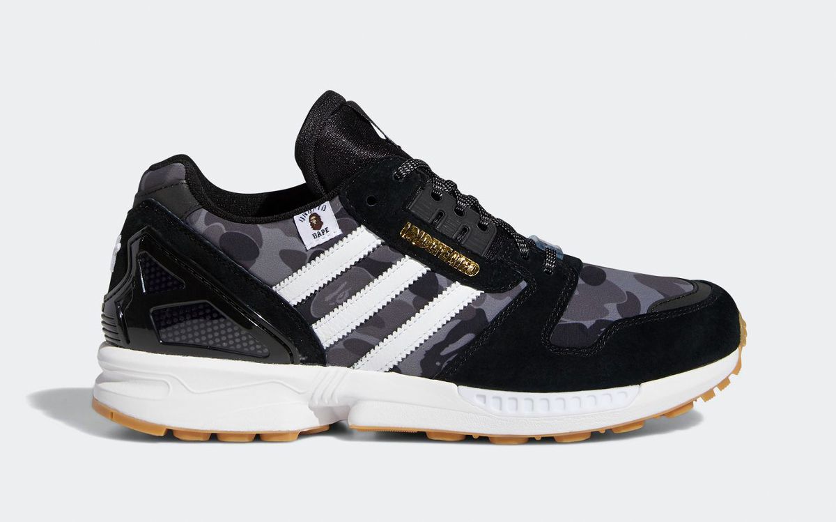 The trio has linked up on the ZX line before, delivering a camo-covered ZX 5000 back in 2013. That pair arrived in olive and gum paired with Tricolore Three Stripes. This year’s pair is yet to be sighted, but a quick glance at the table above shows a black, white, and gum thematic, again with the possibility of the famed Bape camo print.