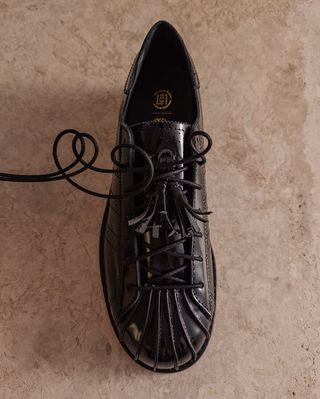 The new design maintains the signature Superstar look but is wholly overhauled in patent black leather, replacing the usual canvas or suede upper. The rubber shell toe stays intact, ensuring the shoe’s iconic status remains. The addition of Oxford-style rope laces and stitched Three Stripes branding further enhances its formal appeal. To stay true to the dress shoe aesthetic, Clot has also removed the padding from the heel for a more refined, sleek look.