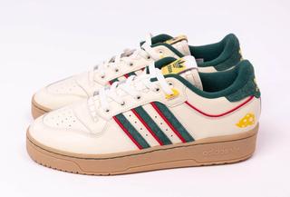 The limited-edition Rivalry Low, dubbed the 414, is infused with Milwaukee’s essence, starting with a cream upper that mirrors the city’s iconic “Cream City Brick” architecture. The tongue of the shoe features this textured design, laying a unique foundation for the rest of the sneaker. The suede Three Stripes are decked out in Milwaukee Bucks’ classic green with red accents, while the heels and the right tongue boast cheese blocks and a pint glass decal, respectively—homages to Wisconsin’s famous cheese and Milwaukee’s rich beer history.