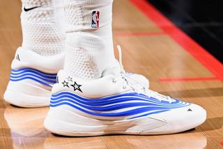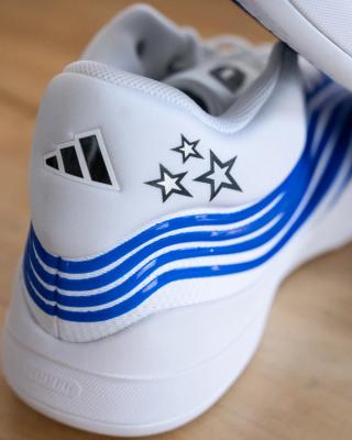 Worn during the playoffs, Franz Wagner debuted an adidas Dame X PE finished in Orlando Magic colors. The pair features a clean white base with Orlando blue TPU overlays wrapping the midfoot and forefoot in layered waves. Black star graphics appear on the heel, tying directly into the Magic’s identity, while subtle adidas branding sits near the toe.