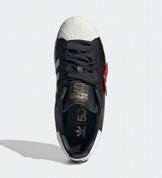 The Hello Kitty x Adidas Superstar features a sleek black leather upper that maintains the silhouette's original charm. It is paired with off-white Shell toes and soles that lend a vintage touch. The heels and medial Three Stripe overlays are rendered in pure white, enhancing the classic contrast that Superstars are known for.