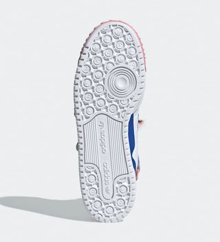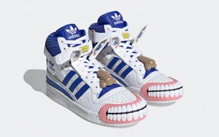 The horrific Centaur-like creation features horse teeth and ponytails, along with humanistic features of eyes and nose — all of which appear to be removable — thank God. All of this rests atop a classic Forum Mid construction of leather and suede in heritage Three Stripe hues. Lastly, Kerwin’s graffiti-like motifs rest at the ankle strap.