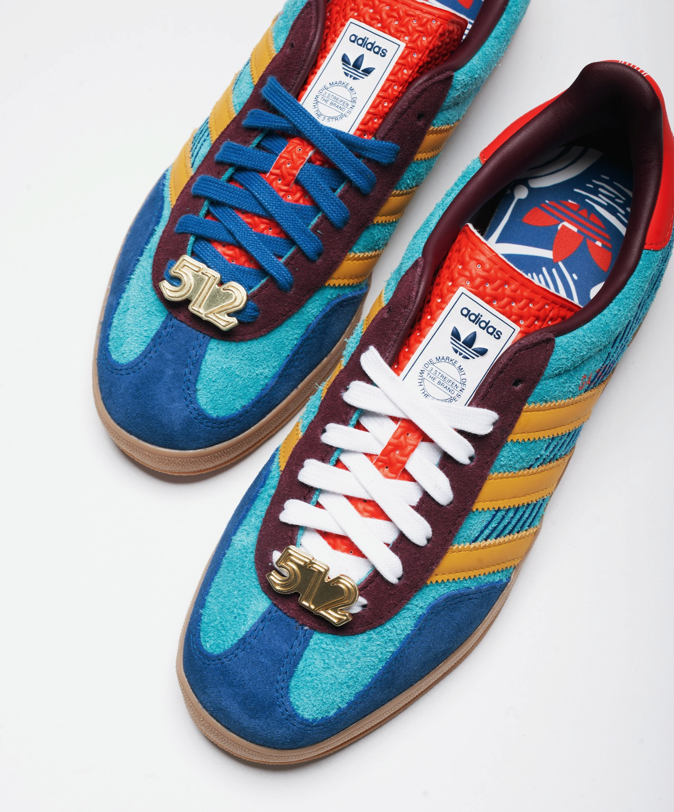 The Kicking It x Adidas Gazelle “Live Music” features a richly layered design with a palette inspired by stage lights and vintage concert posters. The sneaker combines textured blue suede panels with teal corduroy overlays, accented by golden Three Stripes and scarlet detailing across the heel and tongue. The orange sole and embroidered “Live Music” insignia on the heel reinforce its thematic nod to nightlife and performance culture