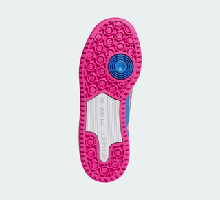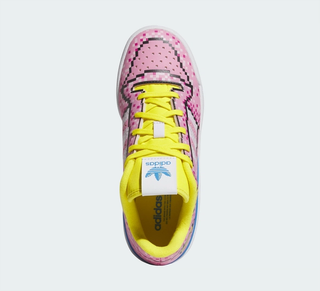 Inspired by the virtual world, the pair features 8-Bit style graphics all throughout the leather upper. A 'Bliss Pink' color animates the bulk of the Kids' shoe, with hits of vibrant 'Yellow' at the tongue and inner lining adding to the playful makeover. Adidas' iconic Trefoil logo on the lateral side also opts for an 8-Bit finish, resembling styles like the Minecraft Superstar inspired by the game's Creeper. Underfoot, the old school sole unit keeps things simple.