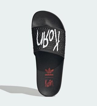 The collection is highlighted by the Korn x Adidas Superstar, a sneaker that perfectly encapsulates the energy and ethos of the era. The sneaker features a sleek black-and-white leather construction, setting the stage for thoughtful embellishments honoring Korn's legacy. The iconic Adidas Three Stripes are transformed with co-branded overlays, while a gilded graffiti-style "Superstar" logo on the sidewall adds a rebellious spirit. The heels and graphic liners carry further co-branding, and the insoles showcase album-inspired artwork, enhancing the shoe's collectibility. Additional unique elements include special guitar-pick hangtags and inner tongue embroidery that tie back to the band's musical roots.