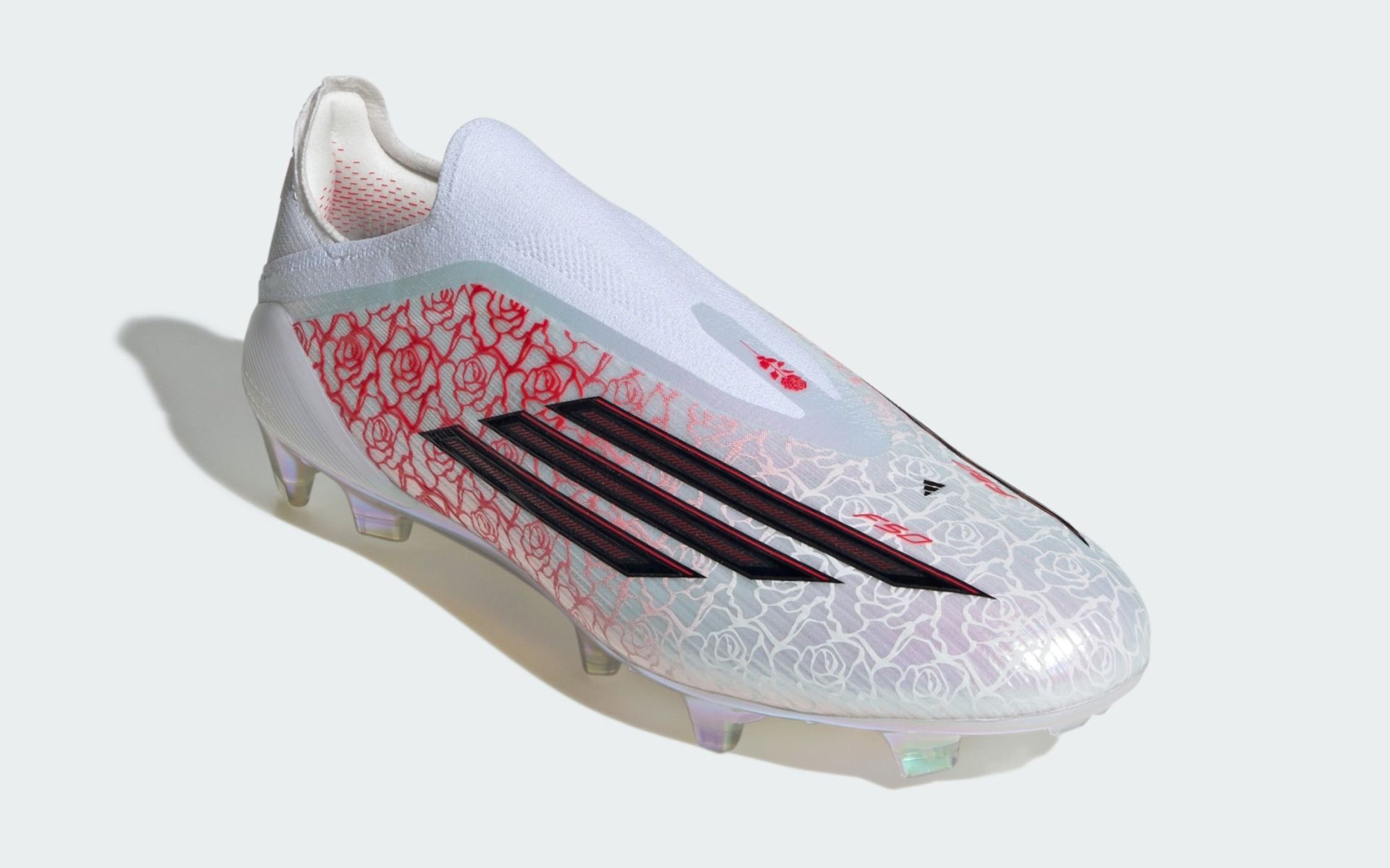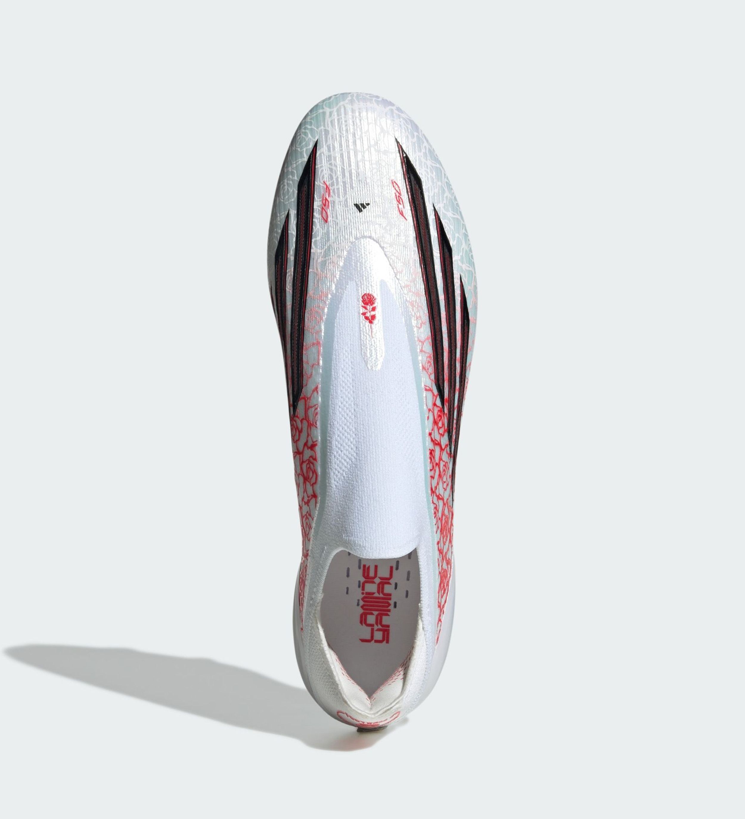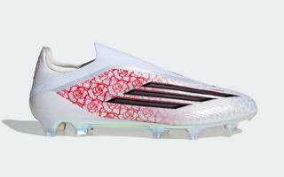 The Laceless F50 and matching items opt for white-and-red color executions that allow for any floral or heart-shaped motif to stand out. The makeover's two-word moniker appears across the collection, which also displays Yamal's Barcelona-inspired emblem in bold red.