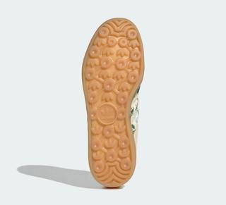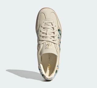 Achilles' heel panels also don the Mitsi Day pattern, which deviates from the predominantly "Crew White" surroundings. The "Tactile Blue" hue introduced by Liberty London is isolated to the print, although wordmarks at the lateral profile, top of the tongue, and footbed indulge in a regal "Gold Metallic" finish. Underfoot, the handball-inspired, semi-translucent gum brown outsole rounds out the Women's Originals offering.