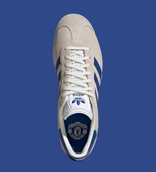 The Gazelle's design takes inspiration from Manchester United’s 2024/25 away kit, which nods to the club's iconic 1990s attire. Unlike the predominantly blue kit, the Adidas Gazelle uses royal blue sparingly, applying it only to the leather overlays. This selective use of blue enhances the luxurious beige suede that constructs most of the upper, while a crisp white tongue provides a striking contrast. Classic gold foil Gazelle branding adorns the sides, and heritage Trefoil logos on the tongues add a touch of Adidas’s rich history.