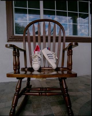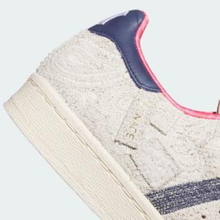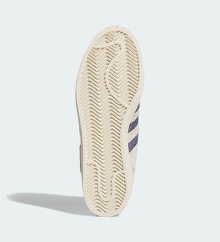Officially clad in a "Wonder White/Dark Blue/Haze Rose" color scheme, the pair's most emblematic detail is the material choice and layout across the upper. An off white suede is arranged in such a way that rectangular and square panels are overlaid atop base layers, creating sections that don't sit flush. Additionally, the sand-reminiscent hue is complemented by curved patterns throughout the profiles. Profile 3-Stripes abandon their typical leather or suede makeups in favor of a flat denim-like execution. A similar "Dark Blue" color takes over the Achilles' heel panel, which features a stylized M on the right shoe; trefoil emblems appear on the left. The material choices and design elements found on the MENACE Superstar reference workwear and working-class culture, honoring the communities that shaped Mena's upbringing and environment.
