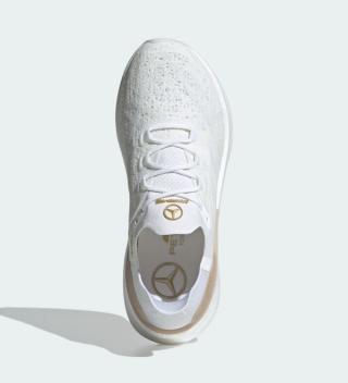 In contrast to the bold color schemes seen in earlier releases, this edition opts for restraint and refinement. Its monochromatic white upper is paired with metallic gold accents on the heel clip and branding elements, including Mercedes-AMG PETRONAS logos at the tongue and Three Stripe branding at the heel. The result is a minimalist yet premium aesthetic that nods to the elevated energy of the Singapore night race.