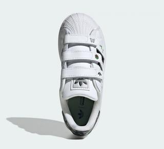 A special, removable lace dubrae appears on the Big Kids' version of the Creeper-inspired Adidas shoes. The Little Kids' shell-toes feature three Velcro straps instead of standard lacing, with each strap referencing either the German sportswear giant or Microsoft's platform.