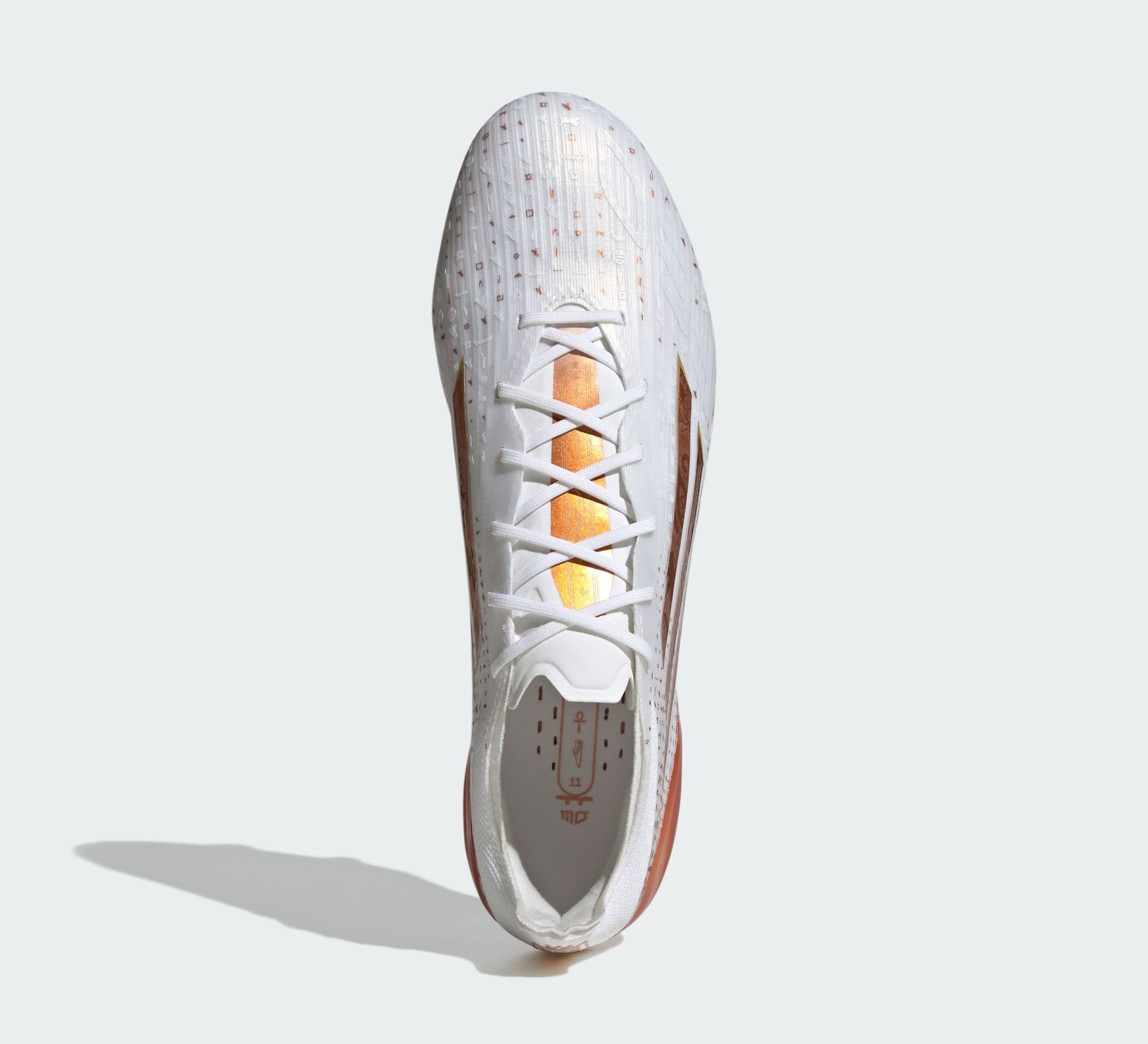 Officially clad in a "Footwear White/Gold Metallic/Golden Beige" color scheme, the impending pair of adidas football foots feature a series of symbols historically associated with Salah's home nation. The F50's FIBERSKIN upper favors a clean finish that allows for the slightest contrast to revel in the spotlight. Graphics of different animals, letters, and shapes appear throughout the top-half, nodding to hieroglyphics found in ancient Egypt. Branding on the sidewalls and tongue opt for a shimmering metallic presentation that also animates pair-specific emblems on the footbed and spine. Salah's jersey number (11) stakes claim to numerous areas, as do mentions of Egyptian King.