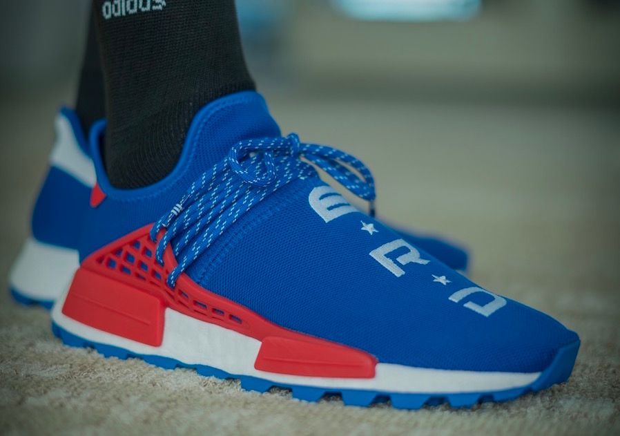 This ultra-limited edition adidas NMD Hu features a patriotic blue Primeknit upper, N.E.R.D embroidered in white on the forefoot and red hitting the lacing system and EVA inserts. It’s finished off on a crispy white mid and matching blue outsole.