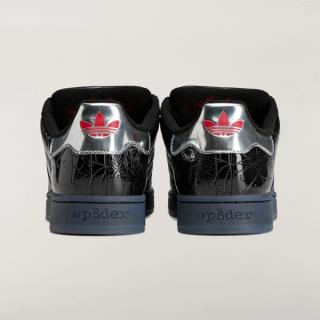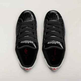 The "Core Black" style features semi-translucent outsoles that reveal branding elements from Young Thug's SP5DER, as well as a patent leather profile 3-Stripes, and a series of web-shaped patterns embossed across the uppers.