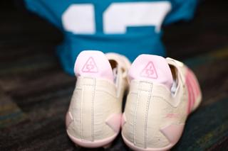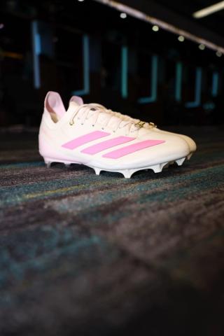 Drawing inspiration from the alligators native to Jacksonville, the design leans into a muted, almost pale palette. The upper is largely off-white or cream, with touches of sandy pink across the Three Stripes, branding, and accents. A gold nameplate adorns the laces, offering a signature touch for the Jaguars’ rising star.