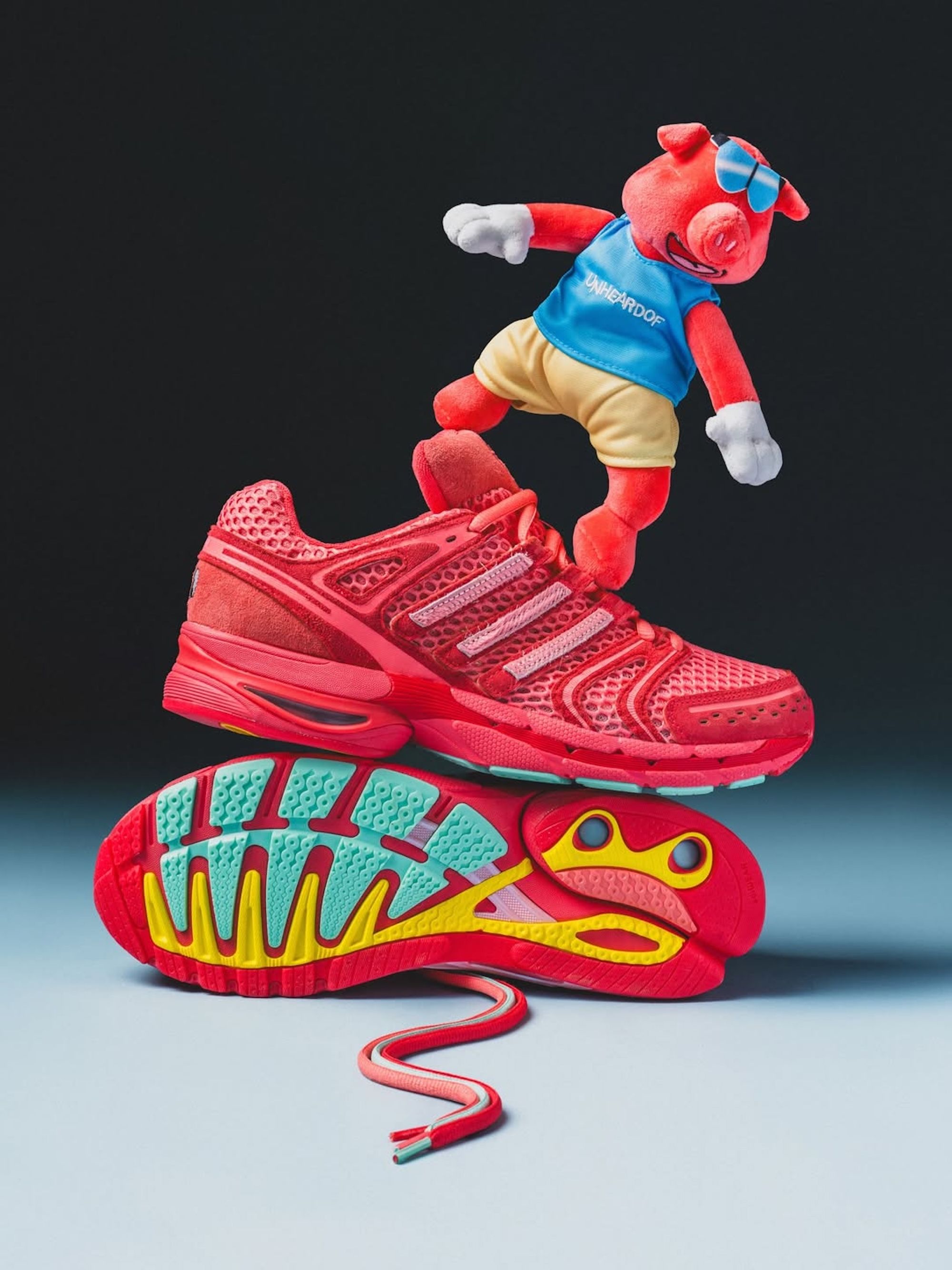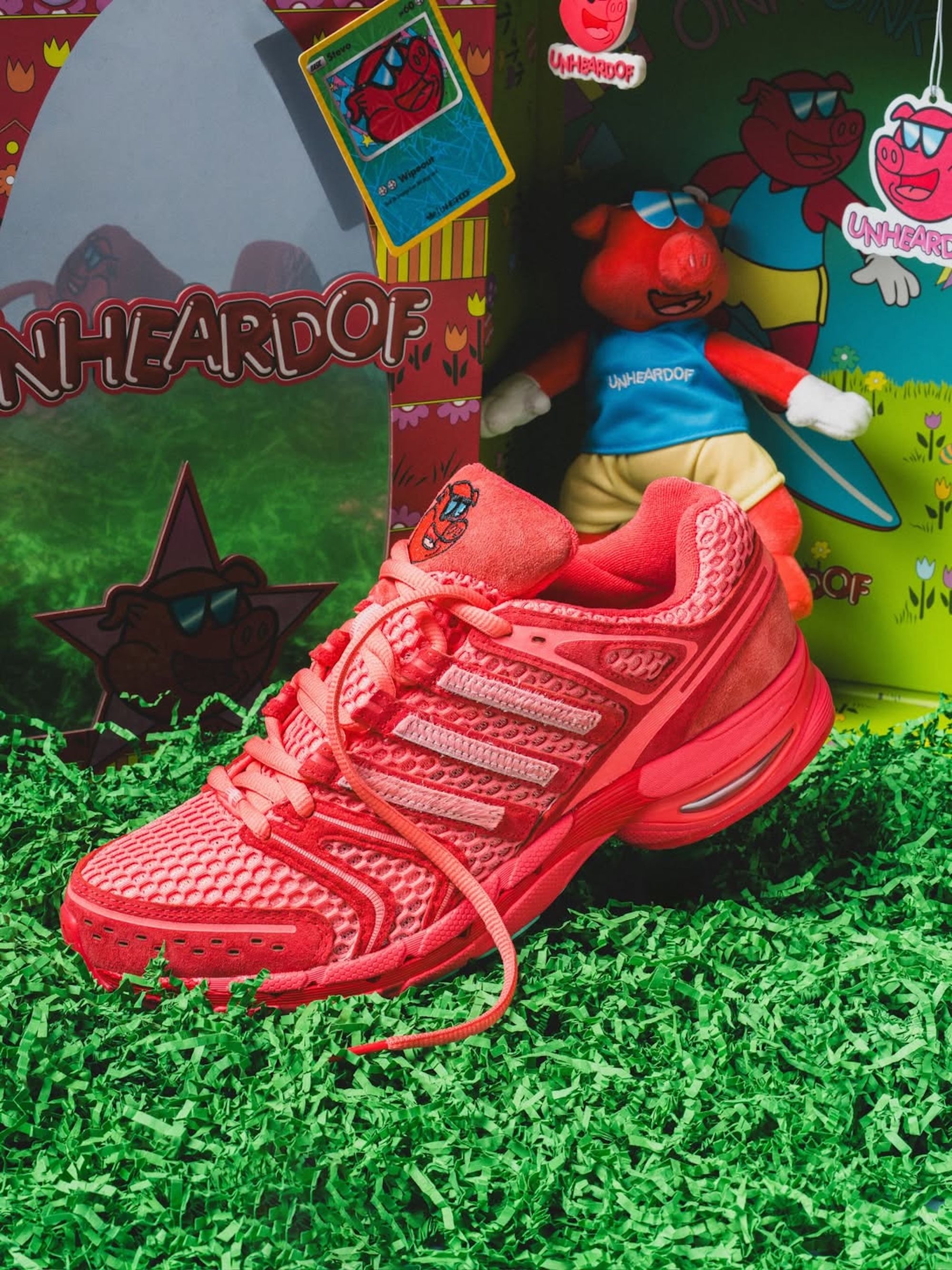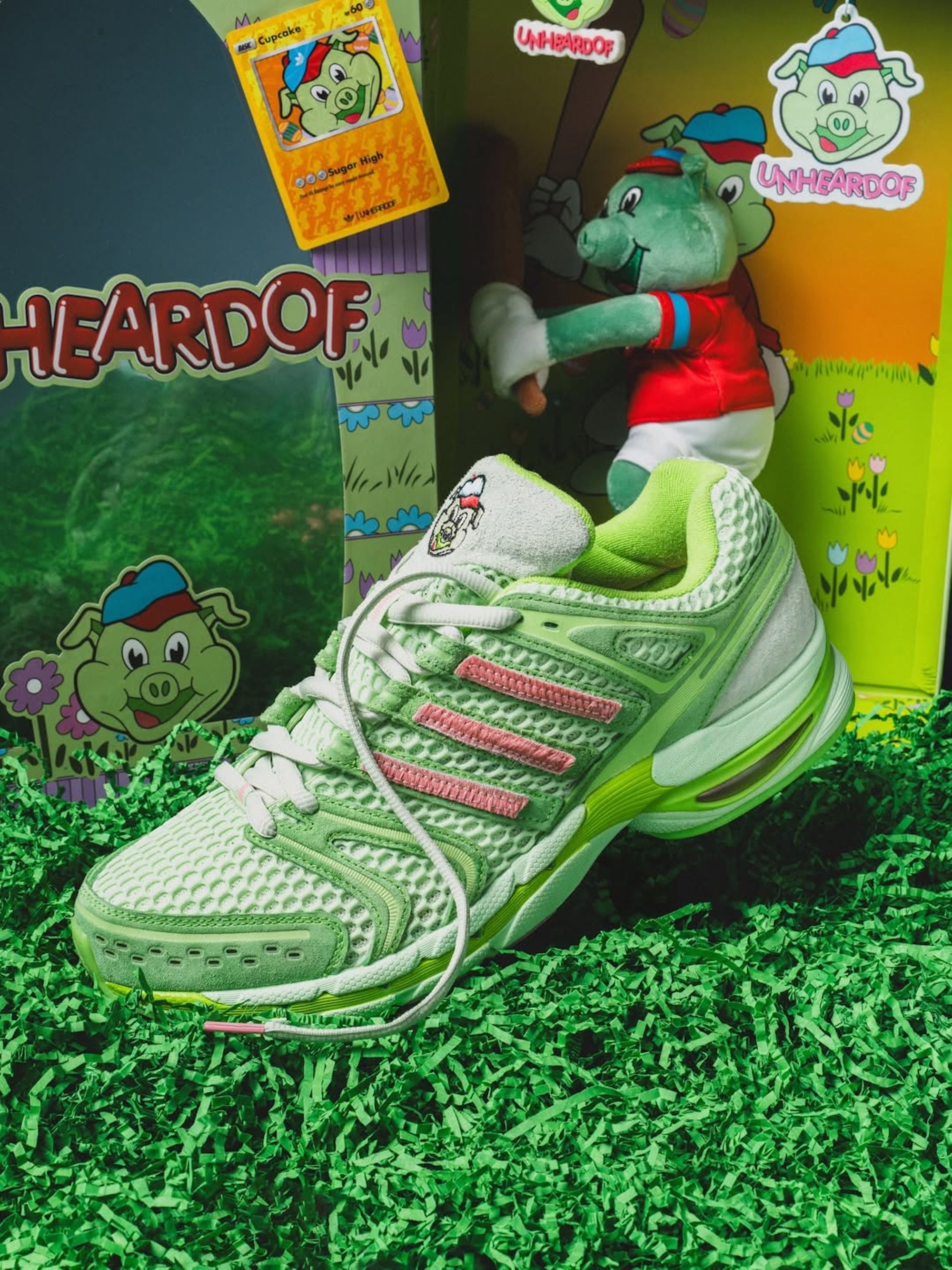 A quick glance at the sneaker unveils a green-and-pink color palette, which Lipschutz has already dubbed "Piggy Runner 2.0" as a nod to his brand's highly-popular Adistar Cushion 3 from last year. Branding on the profiles, the visible cushioning at the heel, and traction zones indulge in eye-catching pink, allowing the remainder of the model to boast a mostly green finish. Unheardof's Porky mascot claims real estate throughout the pair, making the collab unmistakably part of Lipschutz's growing roster.