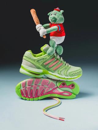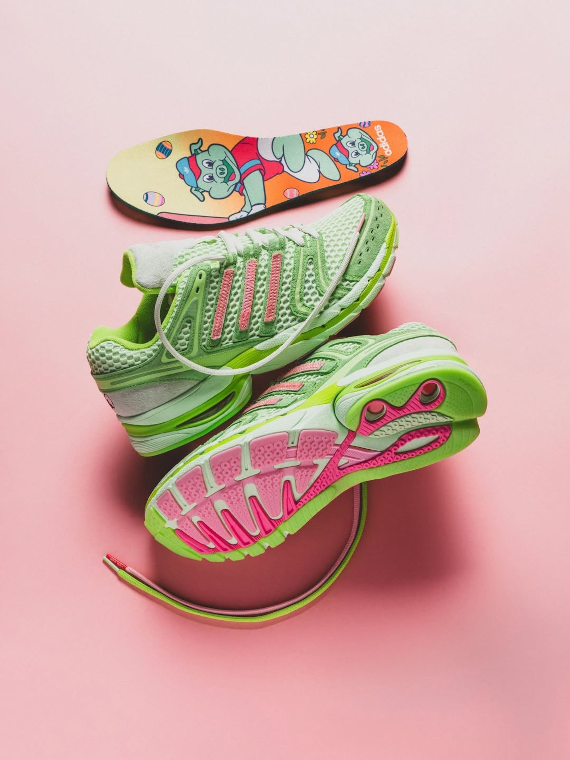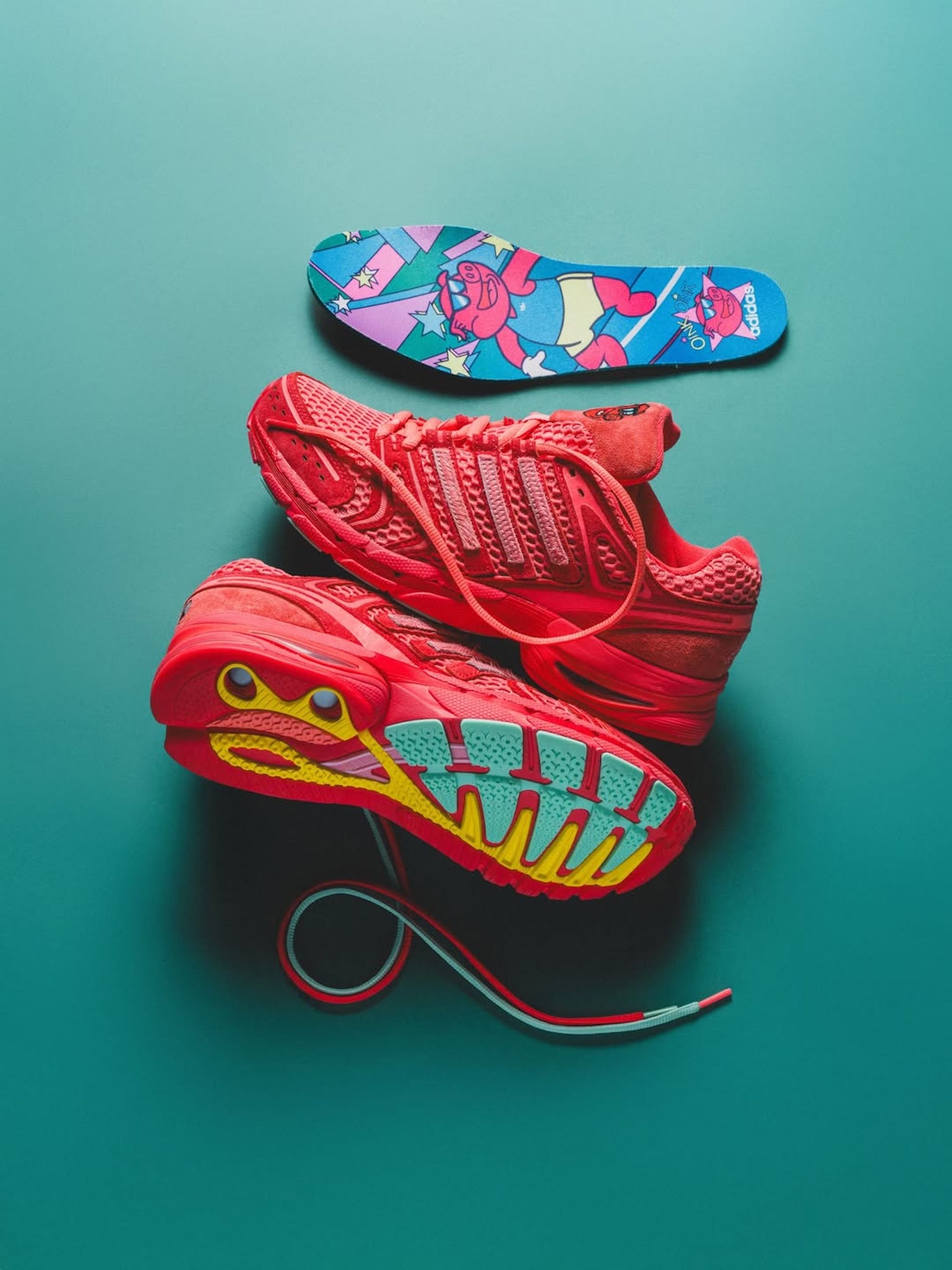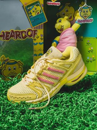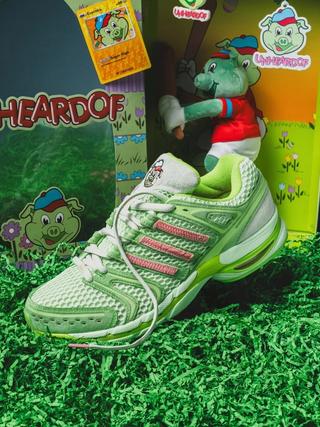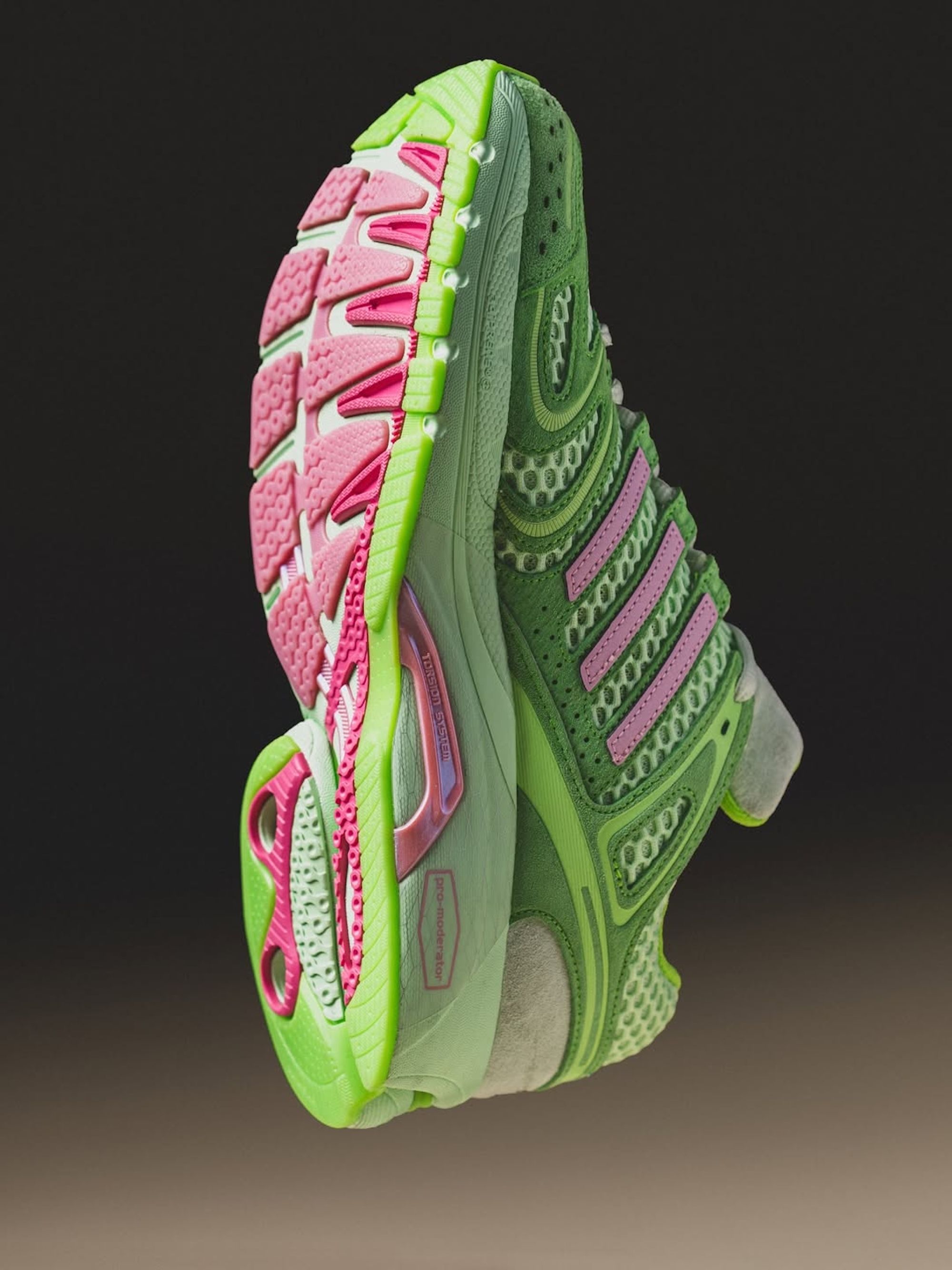 A quick glance at the sneaker unveils a green-and-pink color palette, which Lipschutz has already dubbed "Piggy Runner 2.0" as a nod to his brand's highly-popular Adistar Cushion 3 from last year. Branding on the profiles, the visible cushioning at the heel, and traction zones indulge in eye-catching pink, allowing the remainder of the model to boast a mostly green finish. Unheardof's Porky mascot claims real estate throughout the pair, making the collab unmistakably part of Lipschutz's growing roster.