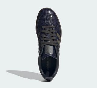 The cover attaches to the Adidas Samba by way of a brass grommet on the spine. The fashion-friendly element also takes on a dark-colored snakeskin makeover, with trefoil branding opting for "Olive Strata" contrast. Underfoot, the tried-and-proven sole unit keeps things classic in a dark gum finish.