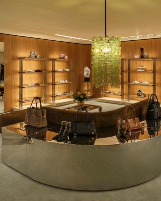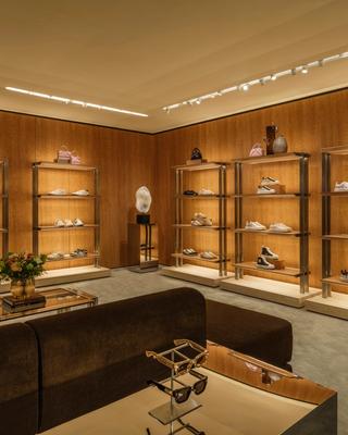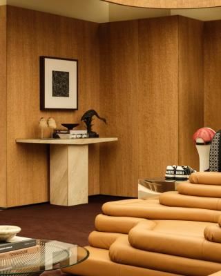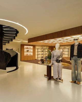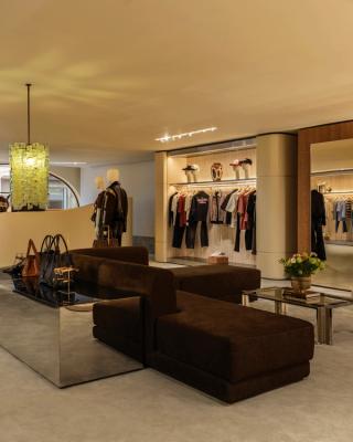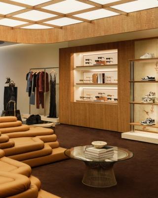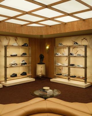 Furnishings include a mix of vintage pieces, custom designs, and curated artwork, reinforcing a more residential feel rather than a traditional retail layout. The result is a space that presents the collection in a more immersive, lifestyle-driven context.