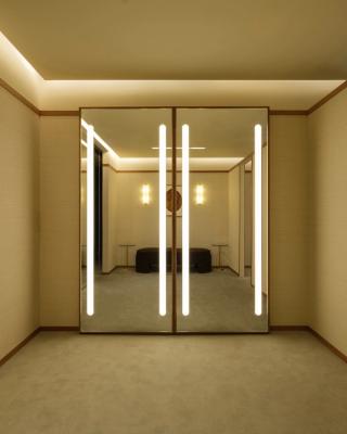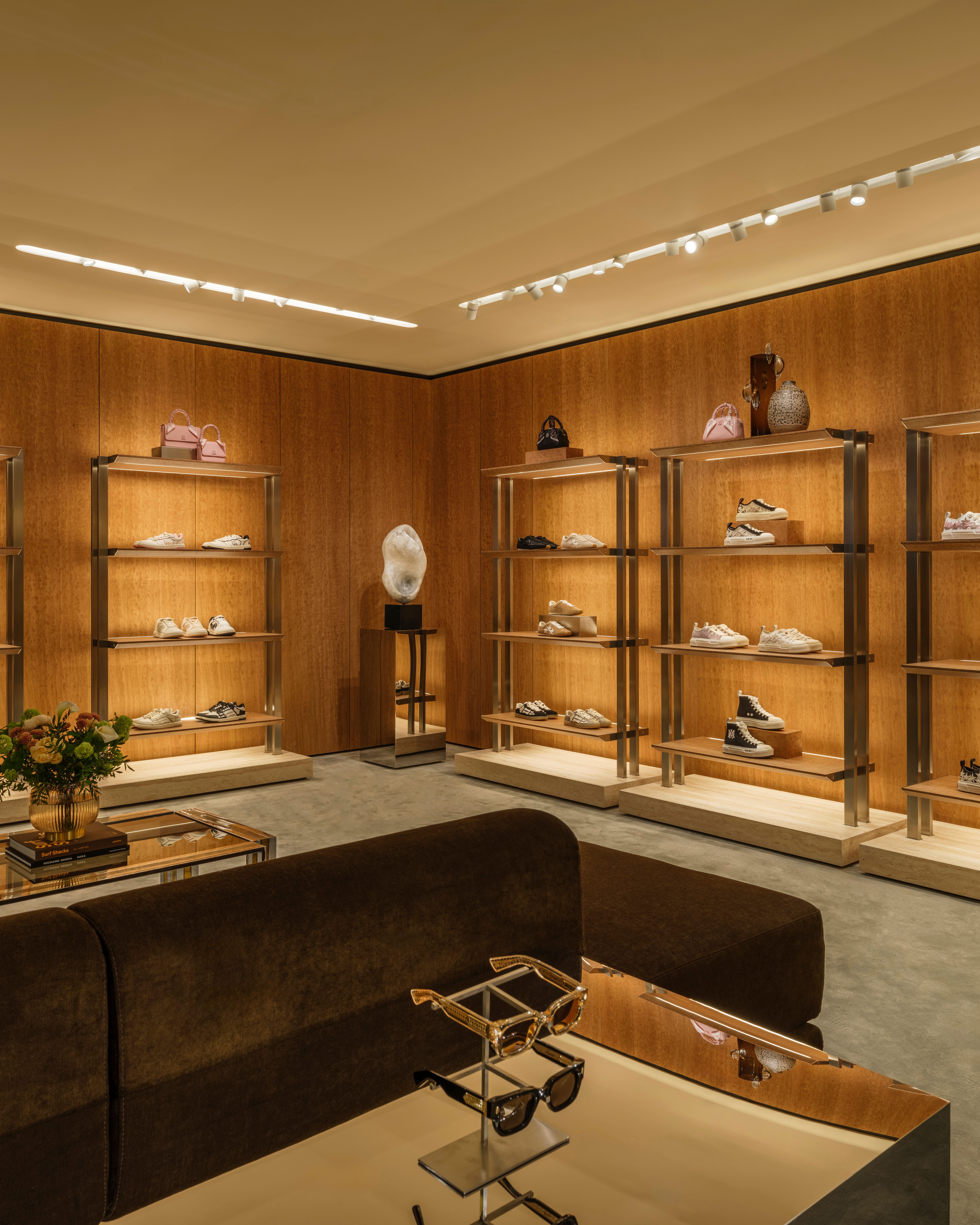Material choices play a central role in shaping the space. Custom wood paneling sits alongside large-scale tapestry artwork, while finishes like travertine marble, onyx, and stone are paired with softer textiles and upholstery. The palette stays consistent with AMIRI’s aesthetic, using neutral tones and layered textures to create contrast throughout.