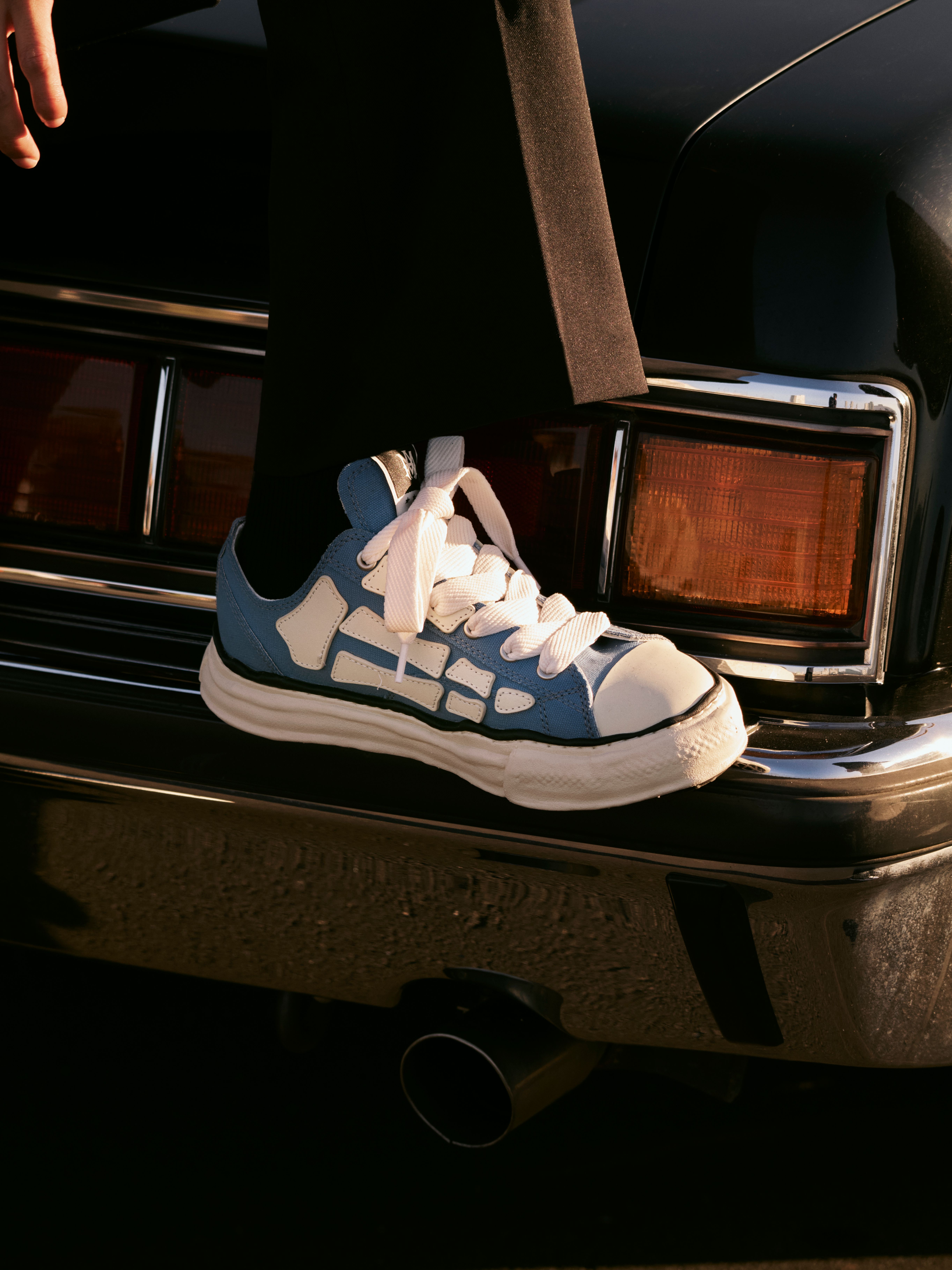 Once again, the collaboration is anchored by two signature silhouettes: AMIRI’s Skel Top-Low and Maison MIHARA YASUHIRO’s Peterson OG. The design merges defining elements from both houses, pairing AMIRI’s Nappa leather “Bones” appliqué with Maison MIHARA YASUHIRO’s distinctive clay-molded sole, set against a durable canvas upper. Co-branded woven and embroidered labels on the tongue and heel highlight the intentional balance between the two brands’ identities.