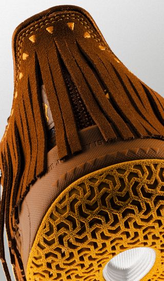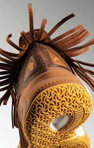 This release is deeply personal and culturally significant, highlighted by the fringes that mimic those found on traditional moccasins, symbolizing a connection to heritage and the wearer's roots. This design element is both a nod to tradition and a statement of modern style, making the KAI 1 "Chief Hélà" a unique piece in the sneaker world.