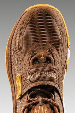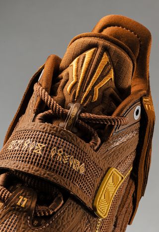“The 'Chief Hélà' colorway is a tribute to the strength and wisdom of the Lakota people and Kyrie’s commitment to his heritage," explains Charlotte Mountain, Kyrie’s thuwin (auntie) from the Standing Rock Sioux Tribe. "It represents a bridge between past and present, blending cultural significance with contemporary design."