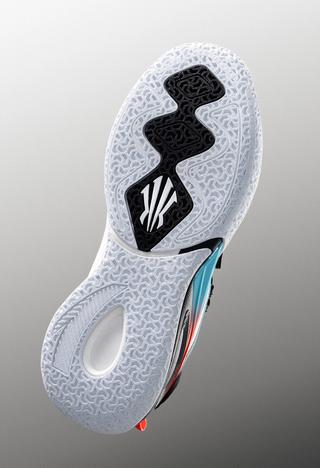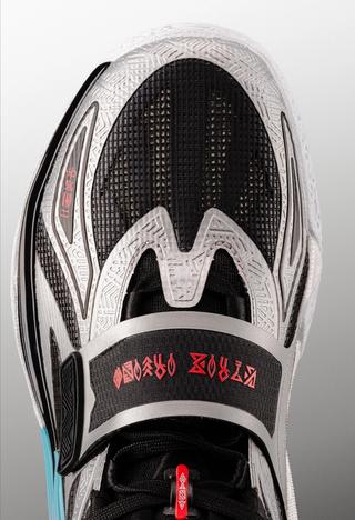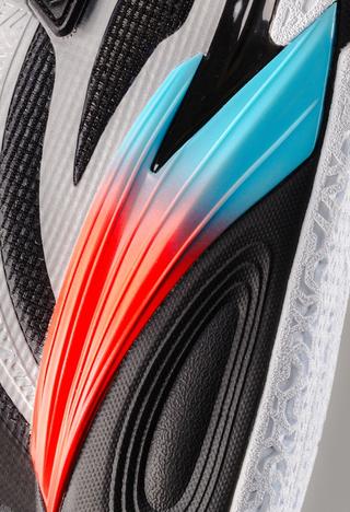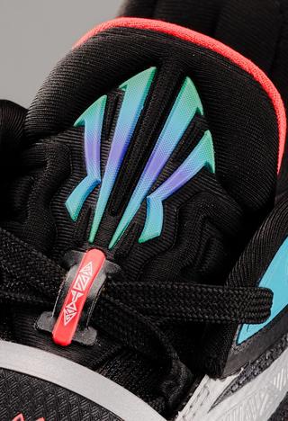 The KAI 1 "KAI-LEIDOSCOPE" features a sleek black and silver base, accentuated with vibrant red and blue highlights, mimicking the captivating reflections of light within a kaleidoscope. This striking colorway is further complemented by gradient hues on the tongue and inner lining, enhancing the visual appeal and echoing the fluidity of Kyrie's movements.