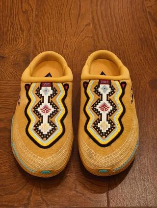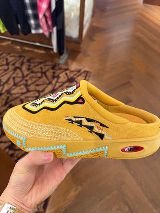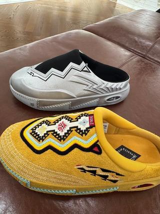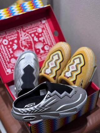 Shared to social media by Instagram account @atatf, the slip-on design is built atop the same performance-first sole unit found on the ANTA KAI 2. As with other styles offered from the collaborative relationship, the laceless model is laden with ornate elements rooted in Irving's Native American background and other philosophies. The two inaugural pairs demonstrate what's possible on the backless design, landing in yellow suede and shimmering silver molded presentations. Regardless of their material execution, each pair promises to deliver comfort, style, and meaning.