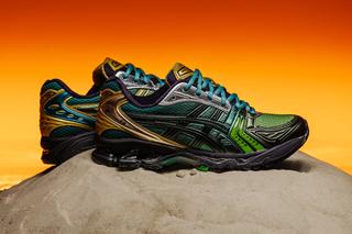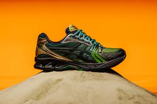 The P Andrade x ASICS GEL-Kayano 14 introduces a striking design inspired by the natural world, likely drawing from the reptilian fauna of Andrade's Brazilian roots. The sneaker features a unique diamond-grid pattern on its base, reminiscent of lizard scales, presented in a blend of green and blue hues that enhance this wild, naturalistic vibe. Additionally, the collaboration introduces exclusive branding with "P_A" marking the lateral side of the right shoe, replacing the traditional GEL-Kayano 14 logo.