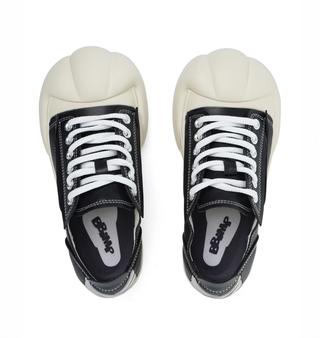 The design's focal point is an exaggerated toe cap that cleverly replicates Bugs Bunny's paws. Uppers crafted from premium black leather are detailed with contrasting white stitching in a style that feels familiar to both the real and cartoon worlds.